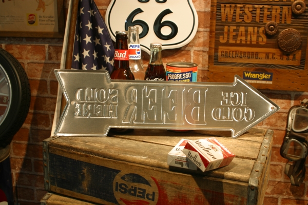 ☆「ビール冷えてるよ〜!」の矢印型サインプレートです。 お店にこんな看板があると、 誰だって冷た〜いビールが飲みたくなっちゃいますよね! 真っ赤な矢印(左方向)は目立ち度ピカイチ! ※取り付け用の穴があいています。 ※画像は同一商品のサンプルです。