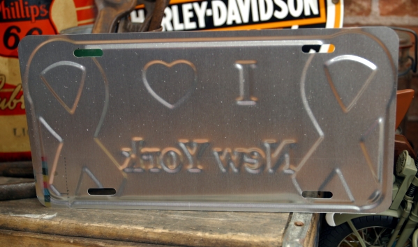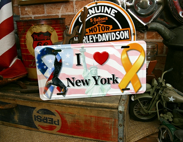 ☆アイ ラブ ニューヨークのライセンスプレートです。星条旗を背景に自由の女神・白頭鷲等、アメリカの象徴をデザイン!!