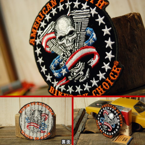 刺繍 ワッペン ◆ BIKER BY CHOICE スカル バイクエンジン 星条旗柄 HL-PPA7613