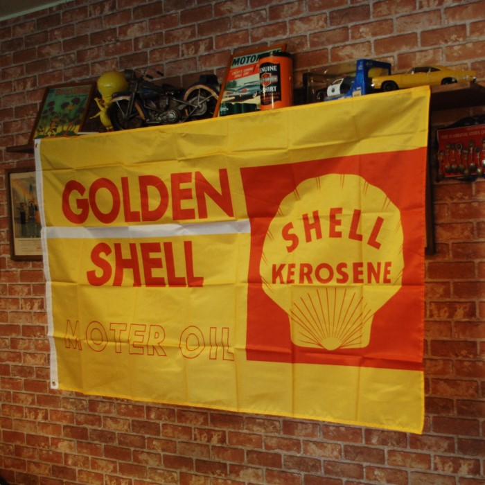 SHELL FLAGMOTOR OIL ☆黄色がトレードマークの「シェル」ロゴフラッグです。 ガレージなどの雰囲気が 一気にモーター感満点に!! ※画像は同一商品のサンプルです。 ※撮影用の備品は商品に含みません。 ※上下隅にハトメがあります。 ※製造時より多少のプリントミスや縫製のズレ等がある場合がございます。あらかじめご了承下さい。 ※本来はインチ規格サイズのため、多少の誤差がございます。
