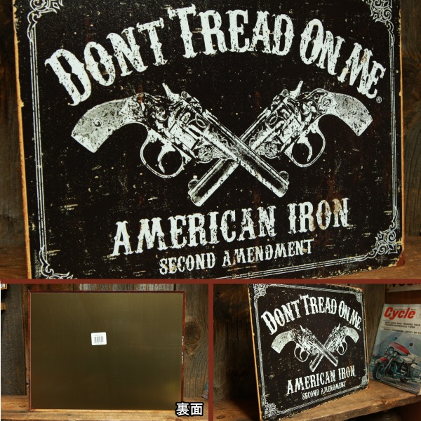 Don't Tread on Me Plate ☆アメリカ西部に飾ってそうな飾り枠と装飾されたリボルバーの看板。 ビンテージ風の加工と白と黒のみのデザインがイカしてる! ちょっとしたスペースにコイツを飾って 「本格的だなぁ」と感じてくれるとうれしいですね!! ※取り付け用の穴があけられています。 ※画像は同一商品のサンプルです。 ※さび等は古味加工で、ヴィンテージ(中古)品ではありません。
