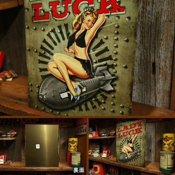 ALADY LUCK Sign Plate ☆砲弾に乗るセクシーガールのサインプレートです。 端が煤けているようなビンテージ風でデザインされています。 軍事系を思い浮かばせる鉄板風の背景とリアルな砲弾がかっこいい アメリカンが好きな方にぜひどうぞ♪ ※取り付け用の穴があけられています。 ※画像は同一商品のサンプルです。 ※新品です。ヴィンテージ(中古)品ではありません。