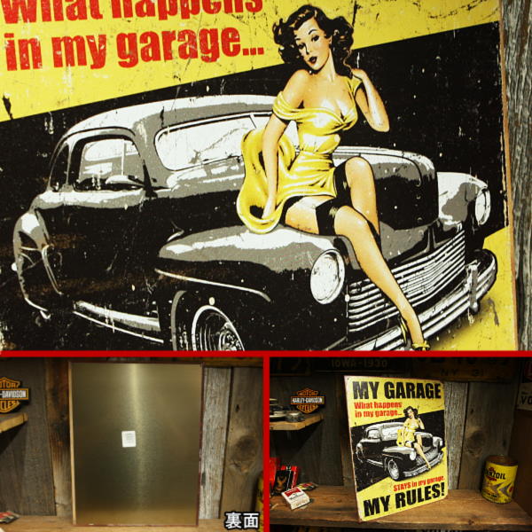 MY GARAGE MY RULES! Sign Plate ☆錆びたようなオールド加工のピンナップガール看板です。 まさに大人のアイテムという感じが伝わってきますね! ※画像は同一商品のサンプルです。 ※取り付け用の穴が開いています。 ※新品です。ヴィンテージ(中古)品ではありません。