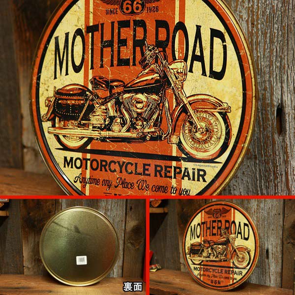 Route66 MOTHER ROAD Circle Plate ☆大人気!ビンテージ風なルート66の丸型サインプレート! ハーレーとルート66なんてアメリカン好きなら誰もがご存知ですよ〜♪ ※取り付け用の穴があけられています。 ※画像は同一商品のサンプルです。 ※さび等は古味加工で、ヴィンテージ(中古)品ではありません。