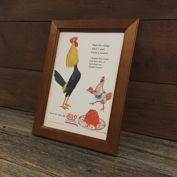 ☆アメリカの雑誌に実際に掲載された、ジェロの広告のリプリントとフレームのセットです。特徴的なニワトリが目立ちます。