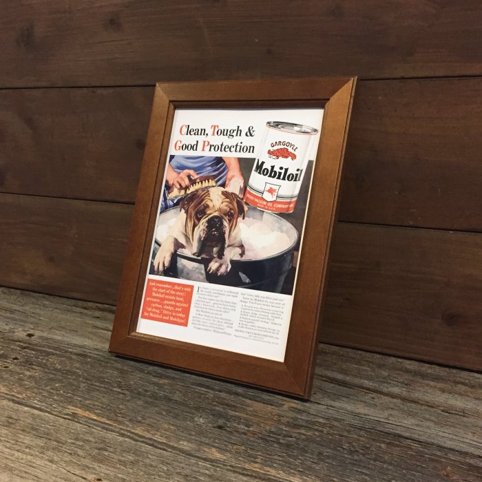 ☆アメリカの雑誌に実際に掲載された、モービルオイルの広告のリプリントとフレームのセットです。桶で洗われているブルドッグがかわいいです。