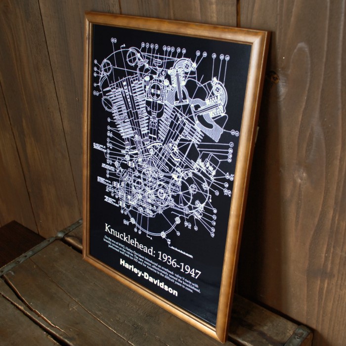 ハーレー ナックルヘッド エンジン アートポスター B4木製フレーム入り ◆ パーツリスト 図面 FB-402