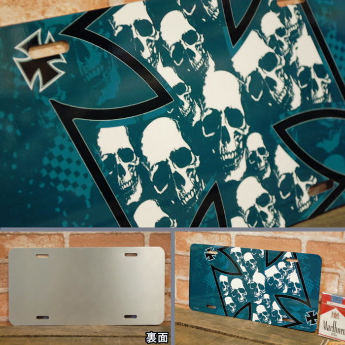 スカルがゴロゴロ!!アイアンクロスとクールなコラボ!! ■このプレートは図柄がプリントされた、フラット(平ら)なタイプです。 ※画像は同一商品のサンプルです。 ※取り付け用の穴が開いています。 ※まれにメーカーの急な仕様変更で写真と実物が若干違う部分がある場合がございます。