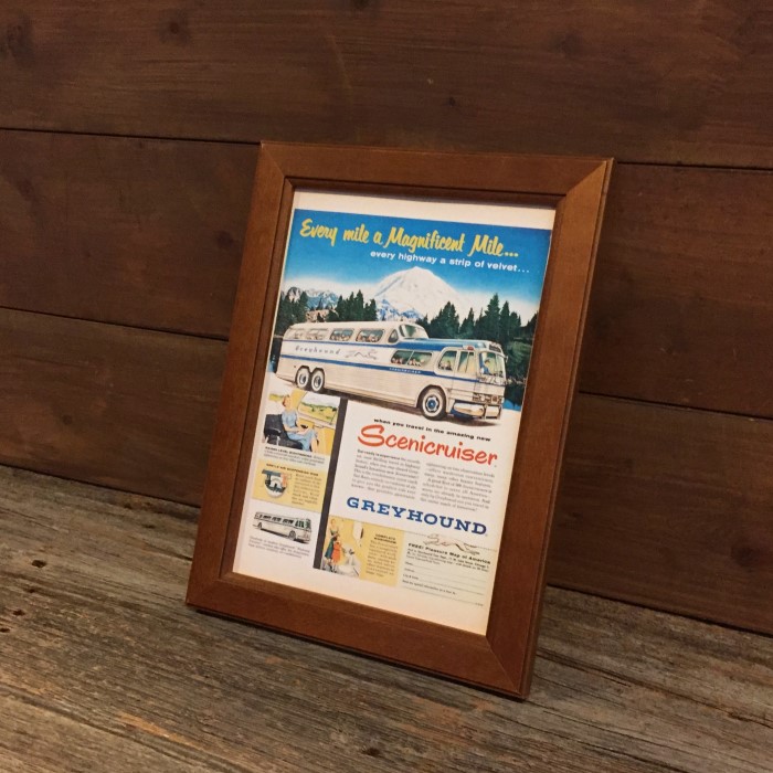 ☆アメリカの雑誌に実際に掲載された長距離バス、グレイハウンドの複製広告です。B5サイズのフレーム入りです。