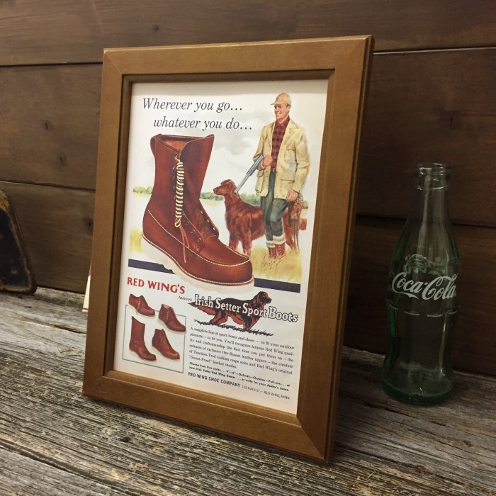 ☆当時を彷彿させる雰囲気満点な複製ミニポスターとフレームのセットです。今も変わらない人気のREDWING 定番のブーツとアイリッシュセッターのイラスト広告が、レトロ感を演出。