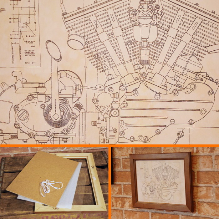 ☆パンヘッド・デュオグライド図面のポスターと木製フレームのセットです。有りそうで無いのがこの小さいサイズのエンジン図面ですよね。
