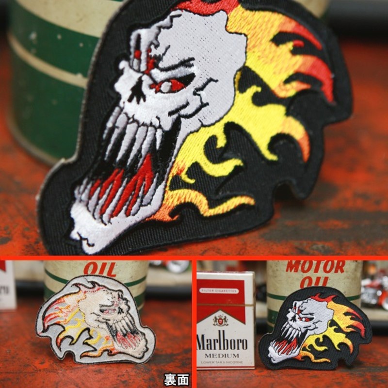 燃えるスカル 刺繍 ワッペン ◆ 火炎 ガイコツ 骸骨 SKULL PT72