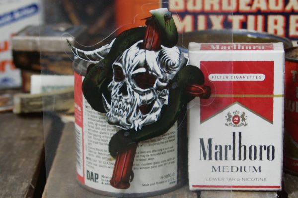 悪魔っぽい角と牙のある頭蓋骨に赤い十字架…Coolなデザインを自分流に使ってみてはいかがでしょうか?
