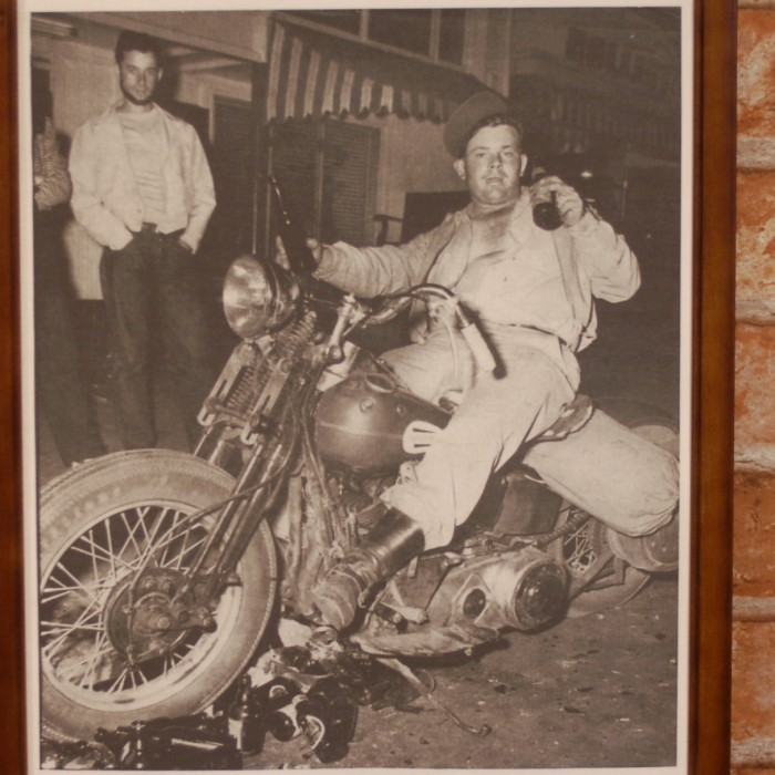 写真は実在するレストラン「ジョニーズ・バー&グリル」の前で、ビール瓶を片手に酔っ払うアウトローバイカーのショット。