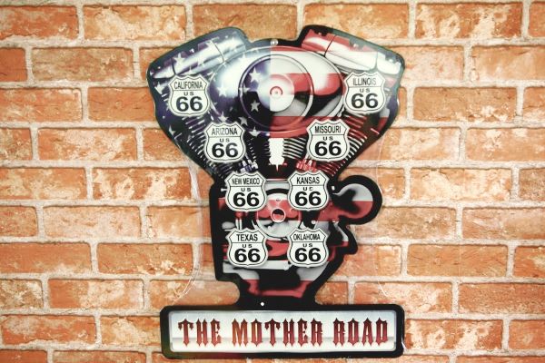 ルート66 標識 ロゴ & 星条旗 V-TWIN エンジン型 プレート ◆ 看板 M-65151