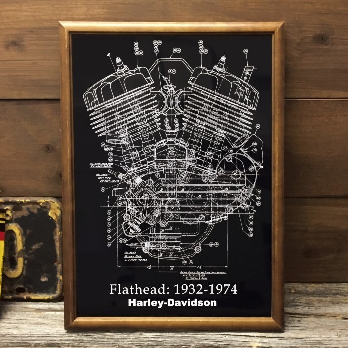ハーレー フラットヘッド エンジン アートポスター B4木製フレーム入り ◆ パーツリスト 図面 FB-403
