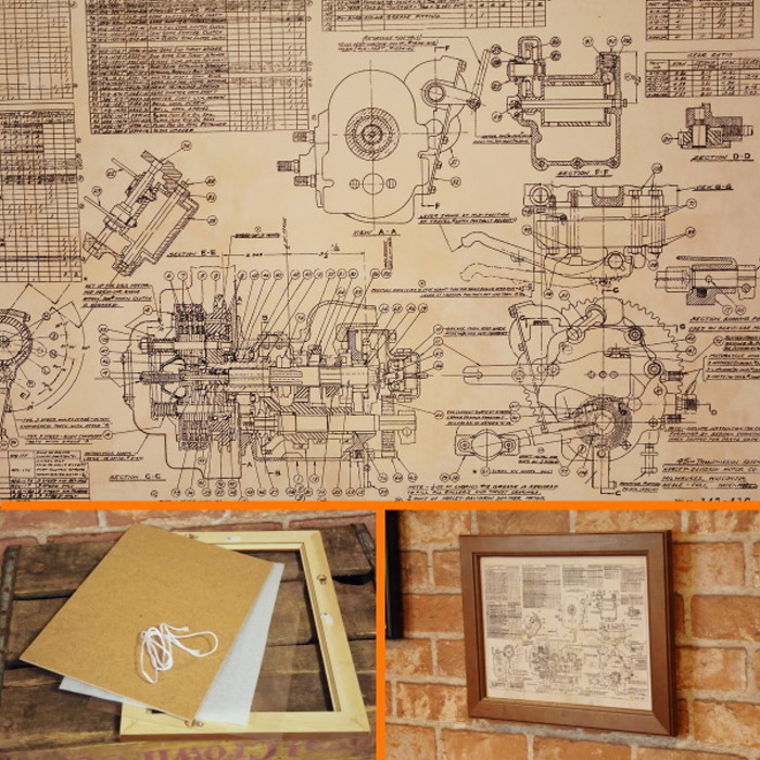 ☆キックペダルスターター図面のポスターと木製フレームのセットです。有りそうで無いのがこの小さいサイズのエンジン図面ですよね。